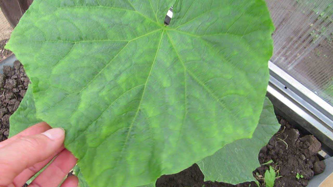Светлая кайма по краю нижних листьев, или краевой хлороз, деформация листа в виде купола — это первые признаки недостатка калия. Калий — легко растворимый элемент, он очень быстро вымывается из почвы. Поскольку огурцы приходится поливать через день или ежедневно, дефицит калия — это самая распространённая проблема при выращивания огурцов.