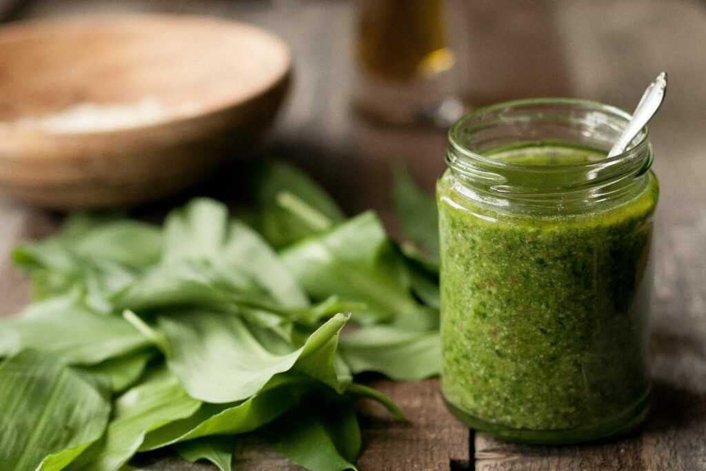 Песто. Смешайть пучок мытых и высушенных свежих листьев с небольшим количеством гималайской соли и оливковым или льняным маслом (около 50 мл) до получения однородной консистенции. Разложить по ошпаренным банкам и залить оливковым маслом. Хранить в холодильнике.