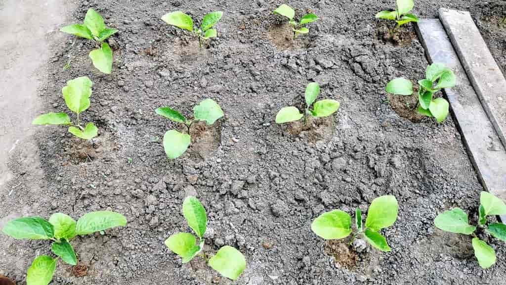 - Ямки обильно поливают водой до образования «болота». В такую «жижу» помещается земляной, торфяной ком с молоденьким баклажаном.