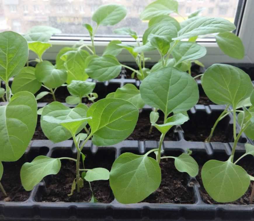 Сажать семена нужно в ряд на глубину 1,5 сантиметра, оставляя между рядами 6 сантиметров. Обязательно накрыть после посадки полиэтиленовой пленкой, чтобы создать парниковый эффект. Температуру в помещение необходимо поддерживать не ниже 25 градусов. Как только появятся первые ростки — ее снижают, но увеличивают солнечное освещение. Спустя пару недель рассаду баклажанов пересаживают в отдельные емкости.