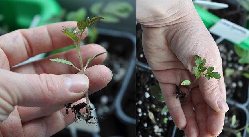 Очень осторожно сеянцы вынимаются из грунта, разделяются по одному. Особенно осторожными нужно быть, если растения были посеяны слишком густо и уже переплелись корнями
