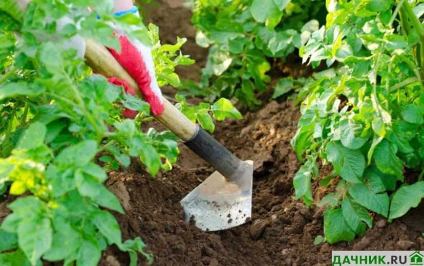 Землю сгребают к основанию растения, создают конус. Это служит для доступа воздуха и воды к корнеплодам, а значит обеспечивает здоровый рост и созревание. Необходимо следить за тем, чтобы инструмент, которым работает огородник, не повредил ростки картофеля.