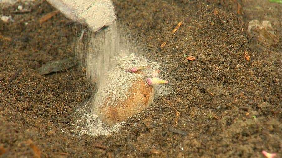 Корнеплоды осторожно раскладывают в углубления глубиной до 10 см ростками к верху, присыпают землей. Грядки выравнивают граблями. Вместо органики можно использовать 1 ст.л