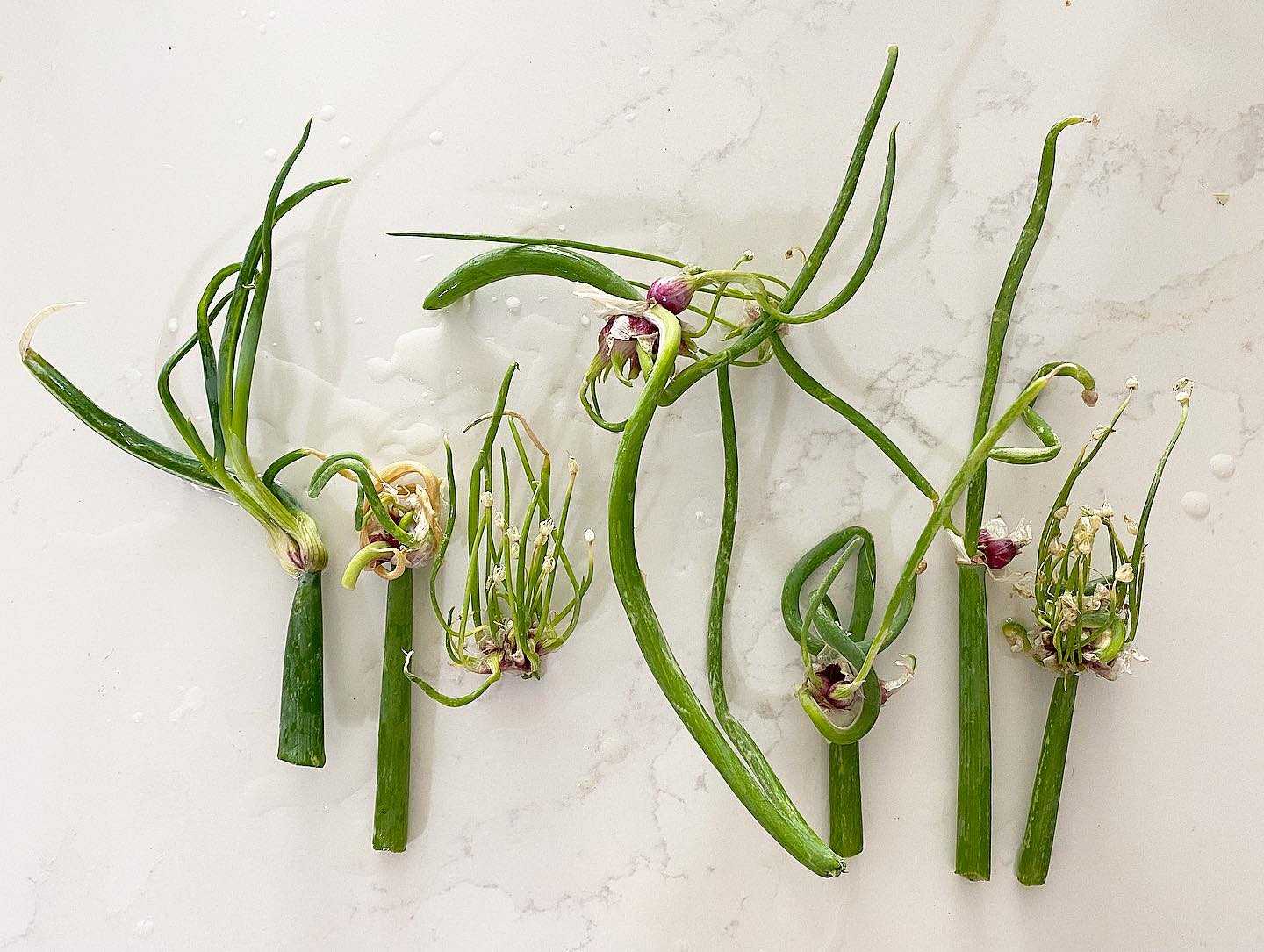 Молодые листья следует срезать как можно раньше, просто к лету концентрация витамина С снижается. Перья срезайте, оставляя пеньки, и удалите их, когда высохнут. Воздушные луковки созревают к концу июля и становятся фиолетовыми, с корневыми бугорками на донцах. Стрелку аккуратно срезают над землёй и отделяют головки. Их можно хранить при нулевой температуре в сухом месте не больше 4 месяцев, сразу рассадить или подать к столу.