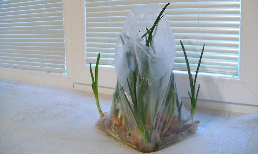 Еще один способ выращивания свежей зелени в домашних условиях заключается в использовании полиэтиленовых пакетов. Для начала их наполняют опилками, влажными бумажными полотенцами или ватой. Далее в пакет помещают луковицы с аккуратно срезанными верхушками. После этого его завязывают.