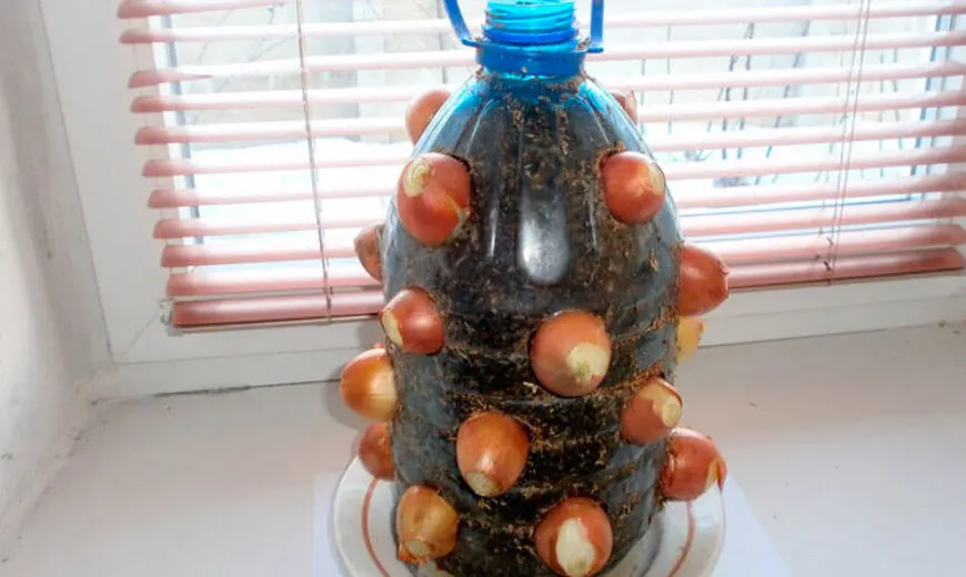 Можно сэкономить место, выращивая зелёный лук в бутылках со срезанным горлышком. В стенках 5-литровой ёмкости вырезают несколько 5–8 отверстий, совпадающих по диаметру с луковицами. Их вставляют внутрь, в бутылку засыпают грунт, хорошо утрамбовывая. Поливают посадки, опуская тару в воду.