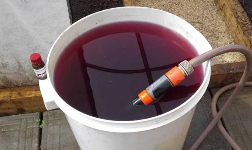 Вносить этот раствор нужно в микродозах преимущественно в виде некорневой подкормки. Понятие микродозы реализуется в пропорциях: 3 г KMnO4 на 10 л H2O.