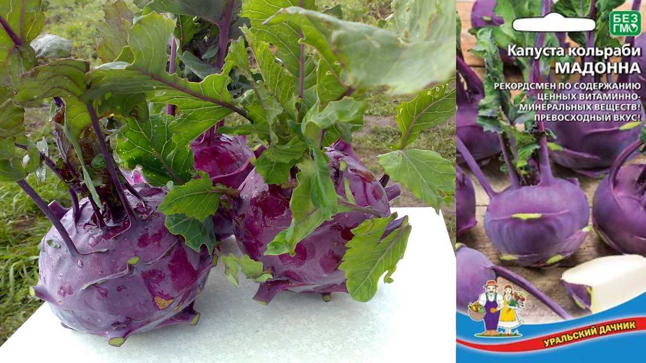 Мадонна. Сорт среднеспелый, созревающий в течении 110 — 130 дней после полных всходов. Растение имеет полувертикальную розетку листьев с листами сине — зеленого цвета со слабым восковым налетом. Стеблеплоды у сорта имеют широко — эллиптическую форму (расширенный эллипс). Наружный окрас — светло — фиолетовый. Мякоть имеет белый цвет и отличный вкус. Вес стеблеплодов бывает 500 г — 700 г. Урожай с 1 кв. м участка может быть 4 кг. Ценность сорта: прекрасная лежкость, хороший иммунитет к болезням, холодоустойчивость, дружное созревание, прекрасный товарный вид.