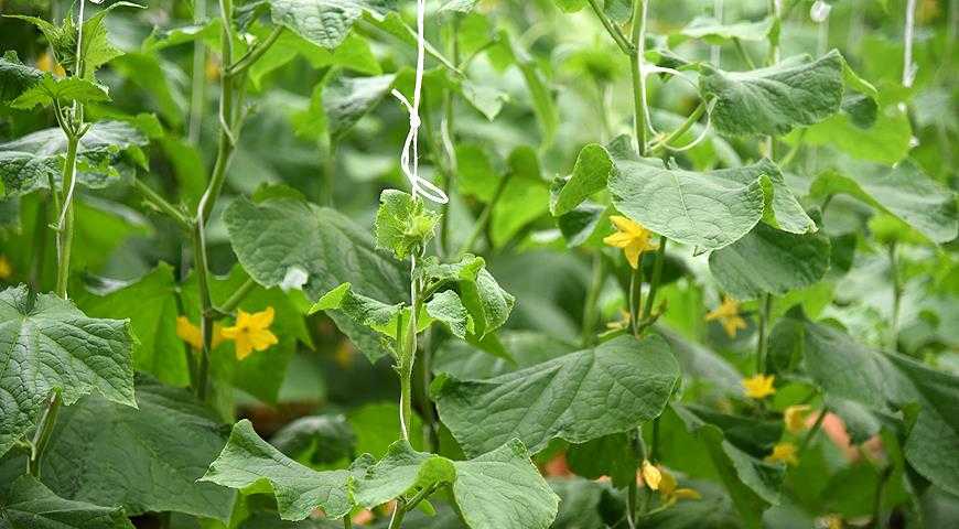 Боковые побеги прищипывают на высоте 1-1,5 метра от земли в зависимости от размера теплицы. Способ позволит выращивать огурцы на малых дачных участках, в теплице по соседству, например с низкорослыми сортами томатов и перцев.