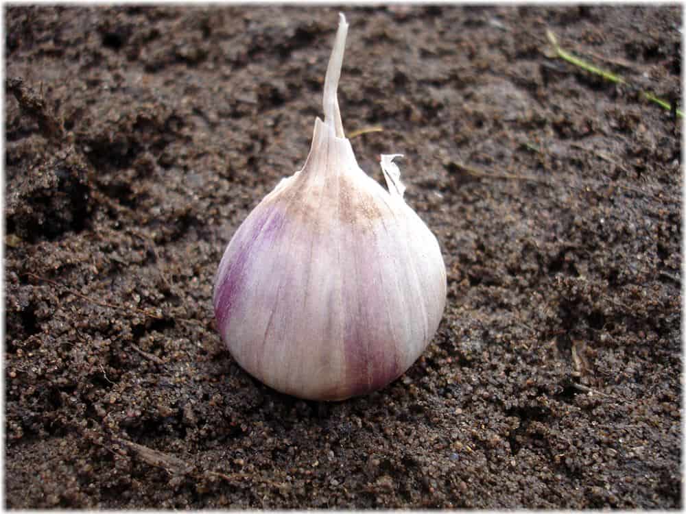 Зубок чеснока необходимо посадить в грунт оставив верхнюю часть на поверхности