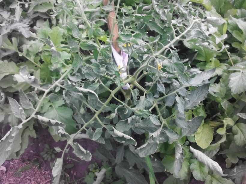 У растений неестественно короткие междоузлия. Молодые листочки тонкие, имеют высветление между жилками. Кончики и края листьев выгоревшие. Нижние листья покрыты пятнами, скручиваются. Урожай слабый.