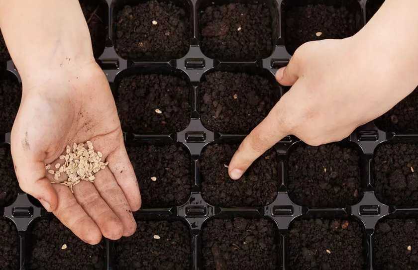 Грунт погружают в емкости. Делают ямки примерно 2 см глубиной. Семечки раскладывают на расстоянии. Хватит отступить 2,5 см. Их присыпают слоем рыхлой земли в 5 мм. Перед посевом почву заранее увлажняют. После укладки верхнего слоя достаточно увлажнить только его.