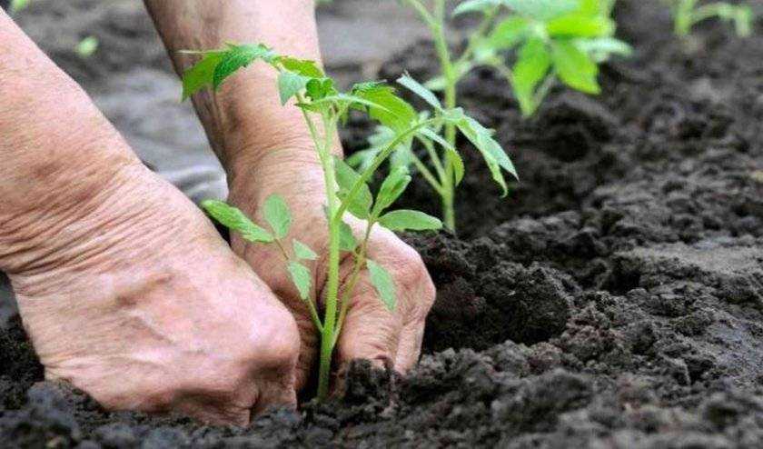 Высаживают помидоры в первой декаде июня. Чтобы рассада не увяла и в дальнейшем не отставала в развитии, высаживать ее на грядку нужно сразу после изъятия из стаканчиков или из парника. Оптимальное расстояние между кустами — 1 м.