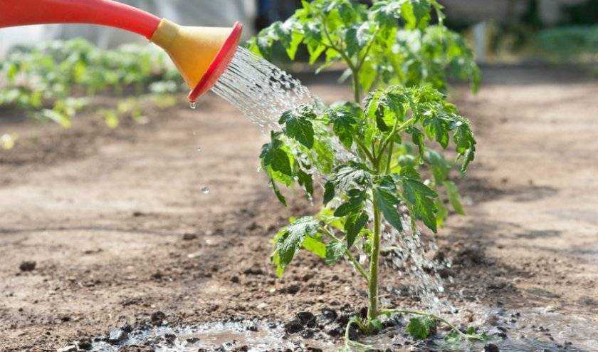 Полив осуществляют рано утром или вечером, ближе к заходу солнца. Даже в жару для орошения кустов томатов нужно использовать только тёплую воду.