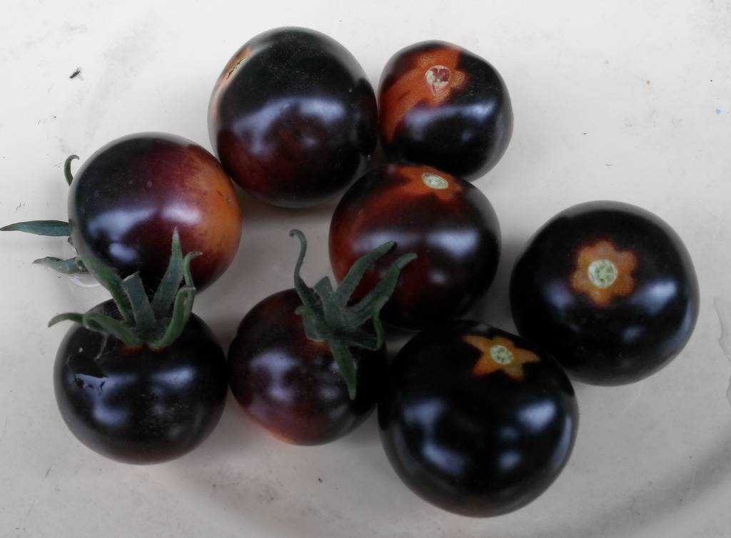 Сам плод представляет собой овощ округлой формы, в начале формирования – зеленого окраса (как и обычные томаты), по мере вызревания он приобретает насыщенный иссиня-фиолетовый окрас, который приближается к черному. Внутри плод имеет яркий алый цвет присущий всем остальным своим сородичам. Вес плодов достигает 40-50 грамм, все овощи на кустах однородные примерно одинаковые в размере, окрас может варьироваться от равномерно – синего, до сине – красного (красным бывает кончик плода).