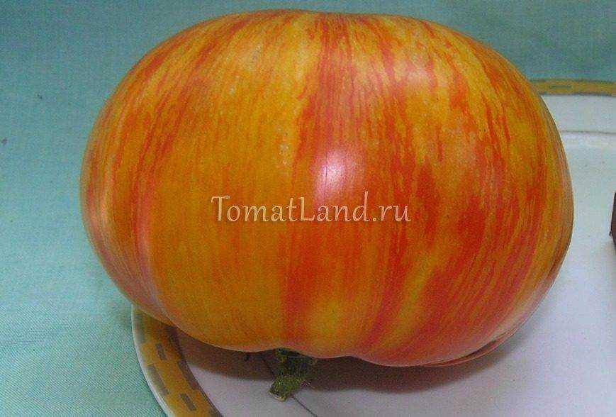 Форма плодов закругленная и немного приплюснутая. Томат слабо ребристый с гладкой кожицей насыщенного красного цвета. Вес одного плода колеблется от 300 г до 1 кг.
