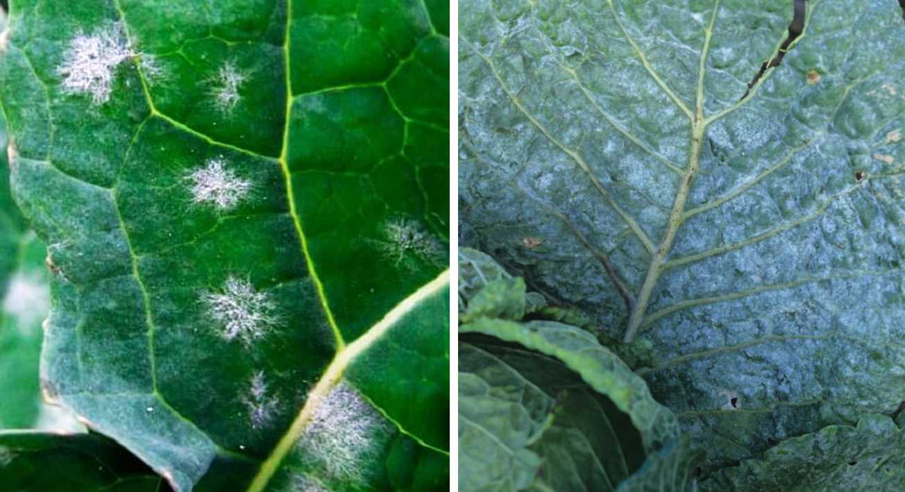 Другое название – ложномучнистая роса, главный ее признак, появление белесых пятен по поверхности капустного листа. На нижней – проявляется мучнистый (светло-серый) налет.