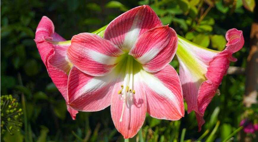 Estella. Сорт известен своим чистым, насыщенным розовым оттенком, который не так часто встречается у гиппеаструмов. Цветки трубчатой формы, украшены четкими белыми полосами. Цветоножки относительно длинные, слегка поникающие, трубка околоцветника длинная 11-15 см. Зеленоватое горло буквально светится, очень эффектный.