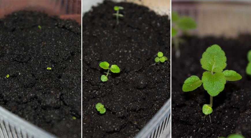 Сеянцы глоксинии: 1 фото — двухдневные, 2. фото — двухмесячные, 3 фото — перед пикировкой
