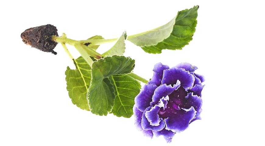 Когда цветок глоксинии увядает, цветонос удаляют и ставят в емкость с водой. Через 3–5 недель на нем образуются корни и маленький клубень. Его высаживают в стерильную земляную смесь (перлит, перлит + вермикулит, мох), и спустя месяц на поверхности земли появятся листья молодого растения.