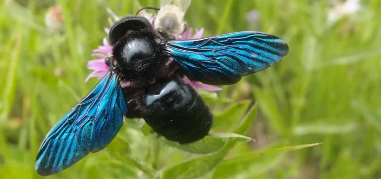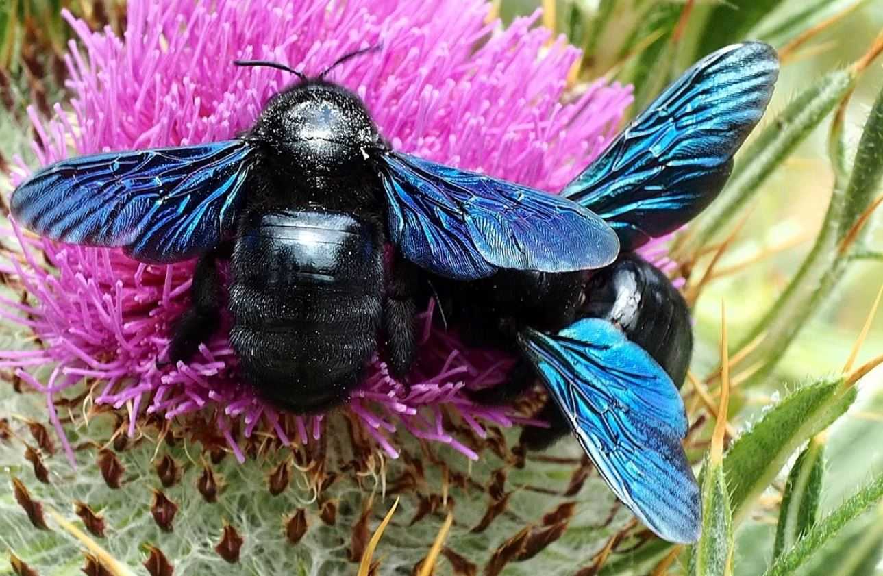 Правильное название: шмель — плотник фиолетовый; охраняется несколькими заповедниками в РФ. По своим габаритам черная пчела обладает большим объемом туловища, чем у обыкновенной особи с желтыми полосами, и имеет ярко выраженные фиолетовые крылья.