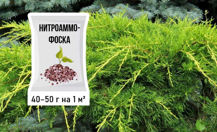 Удобрять можжевельник Пфитцериана желательно всего один раз в год. Однако при необходимости можно делать это и чаще, но не более 1 раза в месяц. Лучшее время для этого — конец апреля или начало мая. В качестве удобрения подойдёт нитроаммофоска. Будет достаточно 40–50 г на 1 м².