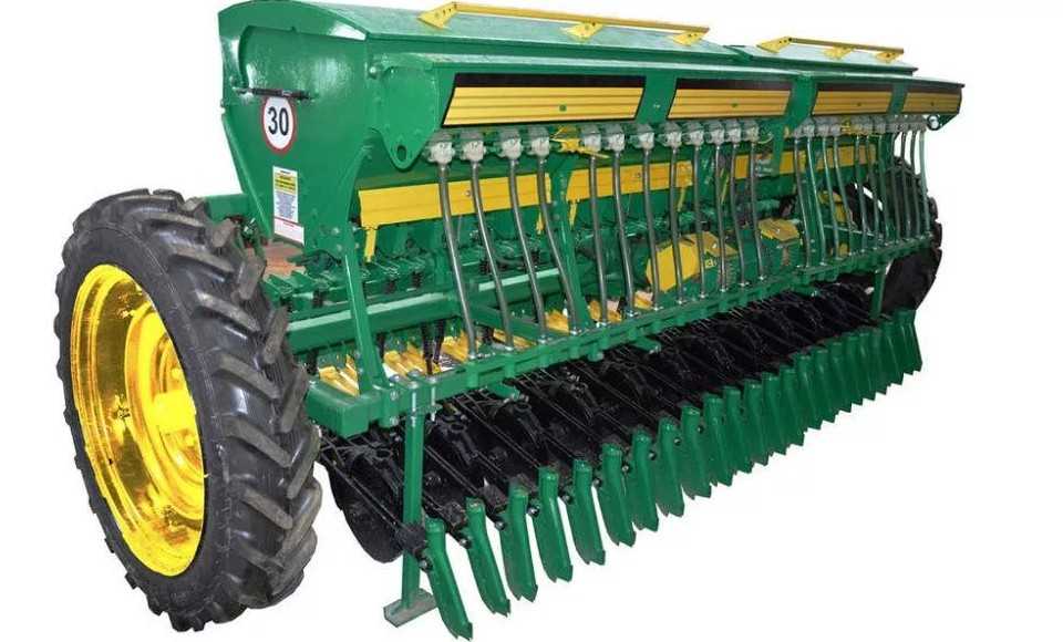 - Сеялка на трактор – навесная установка на трактор. Принцип действия практически такой же, как и у сеялки на мотоблоке, только борозды нарезаются опорными колесами, а после высыпания зерен грядки засыпаются землей из заднего барабана или сошника.