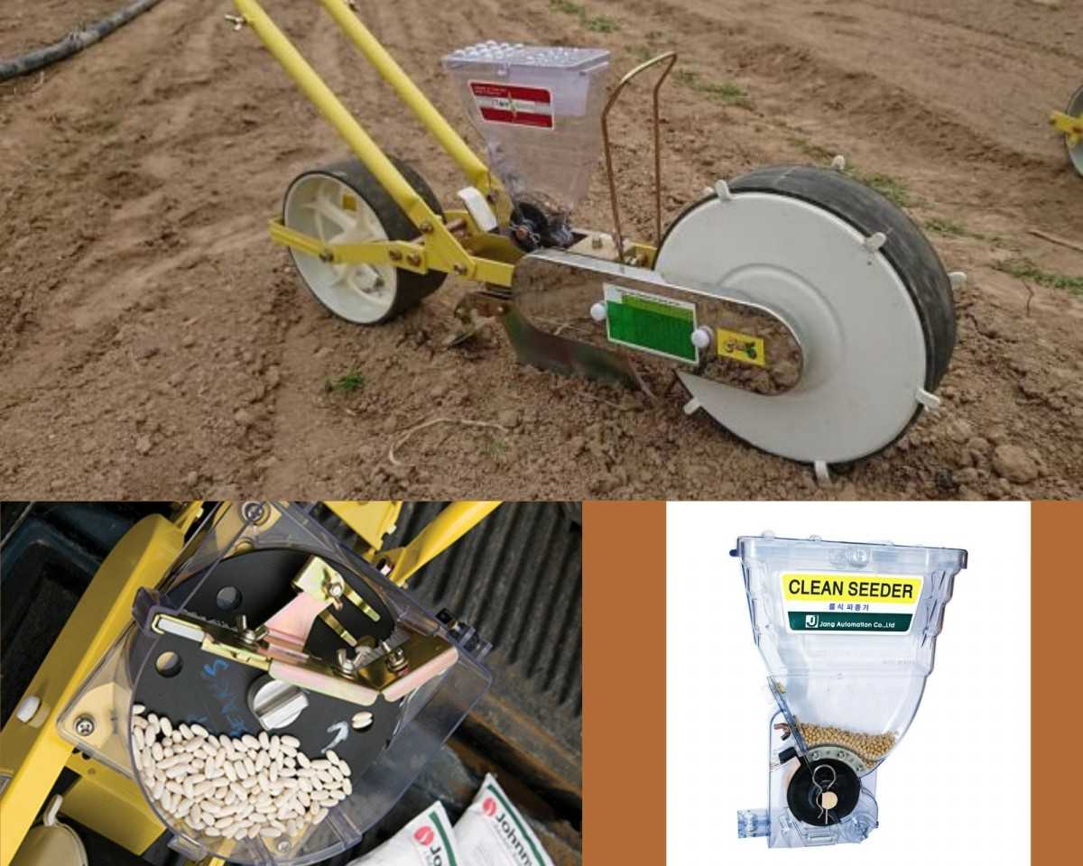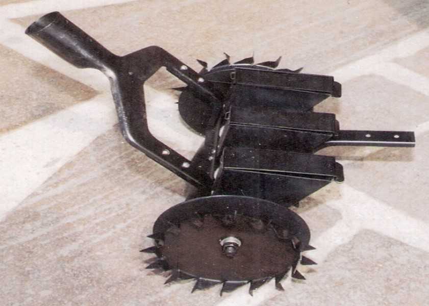 - Ручная сеялка является небольшой коробочкой, в дне которой проделаны небольшие дырочки, на колесиках, в которую насыпаются семена. Колеса формируют борозды, куда попадает семя, после чего задние колеса засыпают их землей.