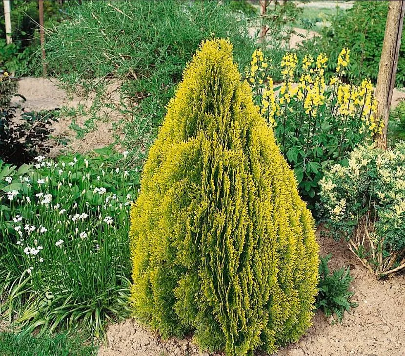 - туя западная Еллоу Риббон – невысокое деревце с конической формой кроны. Хвоя на побегах текущего года ярко-желтая, почти оранжевая, но постепенно она становится светло-зеленой, а к зиме приобретает бронзовый оттенок.