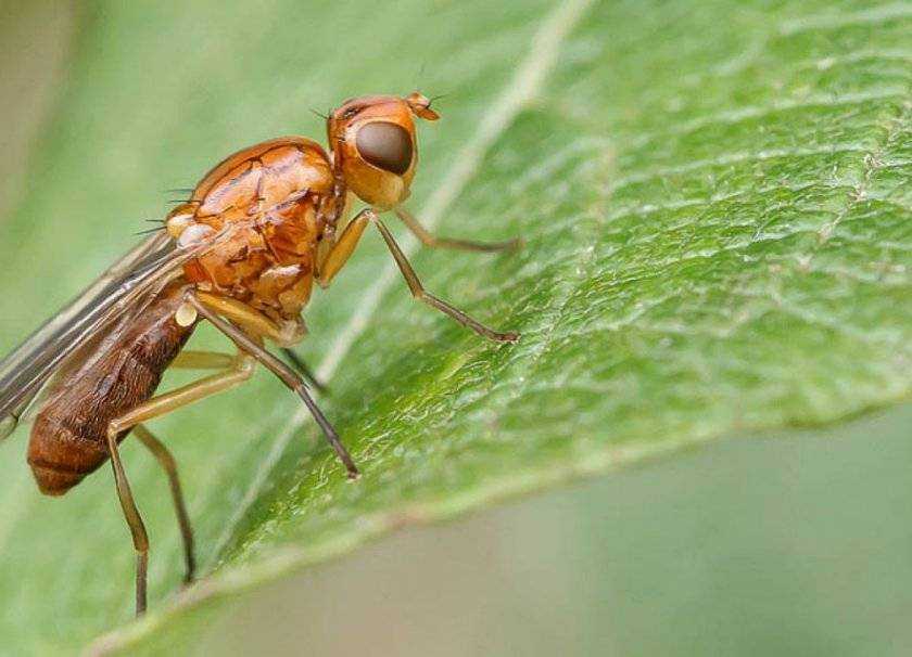 Это насекомое имеет величину 4,5 мм, оно поражает грядки с тмином, петрушкой, укропом, пастернаком и морковью. Личинки безглавые, жёлтые с блеском, достигают в длину 7 мм. Лёт морковных мух начинается с середины мая, когда цветёт яблоня. Они предпочитают тень и влажные места.